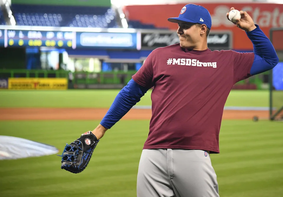 Anthony Rizzo of the Chicago Cubs wears a MSDStrong shirt during warmups on March 29, 2018, in honor of the victims killed in the Parkland, Florida, shooting at Marjory Stoneman Douglas High School. Rizzo graduated from Stoneman Douglas High School in 2007.