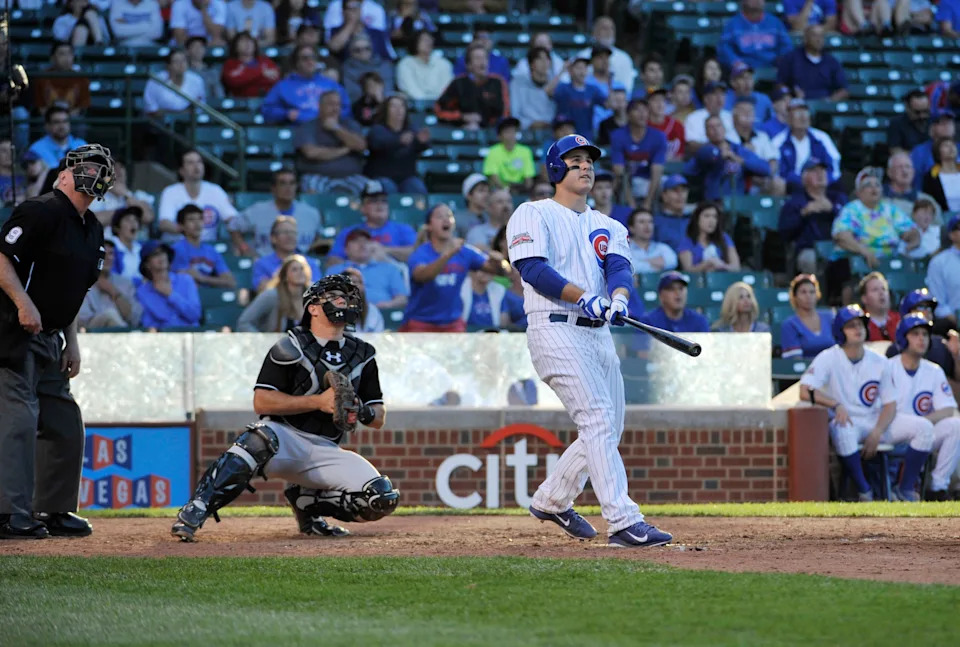 Chicago Cubs first baseman Anthony Rizzo hits a walk-off two run homer against the Miami Marlins at Wrigley Field on June 6, 2014. The Chicago Cubs defeated the Miami Marlins 5-3 in 13 innings.