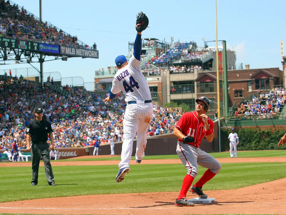 Chicago Cubs first baseman Anthony Rizzo leaps for a throw from the outfield with Washington Nationals left fielder Ryan Zimmerman safe at first base during the eighth inning at Wrigley Field on June 28, 2014.