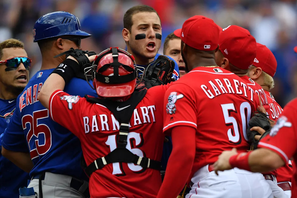 Anthony Rizzo of the Chicago Cubs confronts pitcher Amir Garrett of the Cincinnati Reds at Great American Ball Park on May 19, 2018. Benches cleared after Javier Baez of the Chicago Cubs struck out to end the inning and got into a shouting match with Garrett.