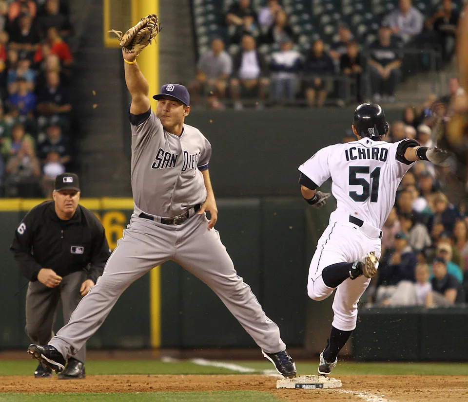 First baseman Anthony Rizzo of the San Diego Padres stretches for the throw from shortstop Jason Bartlett as Ichiro Suzuki of the Seattle Mariners makes the second out of the ninth inning at Safeco Field on July 2, 2011, in Seattle.