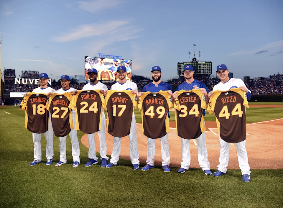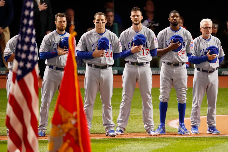 Manager Joe Maddon and Chicago Cubs players Dexter Fowler, Kris Bryant, Anthony Rizzo and Ben Zobrist stand during the national anthem prior to Game 1 of the 2016 World Series against the Cleveland Indians at Progressive Field on Oct. 25, 2016 in Cleveland.