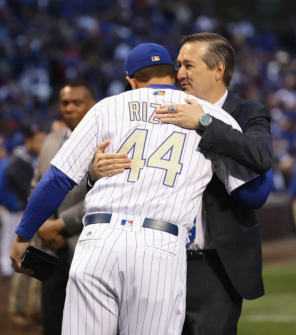 Chairman and owner Tom Ricketts of the Chicago Cubs hugs Anthony Rizzo during a World Series championship ring ceremony before a game against the Los Angeles Dodgers at Wrigley Field on April 12, 2017, in Chicago.