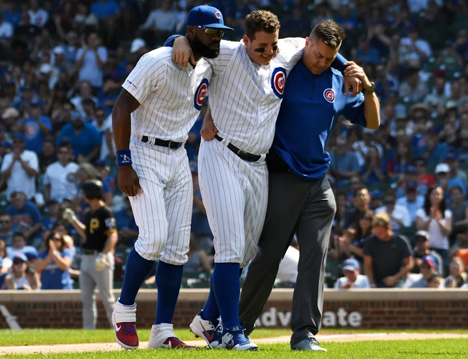Anthony Rizzo of the Chicago Cubs is helped off the field by Jason Heyward and trainer PJ Mainville after being injured against the Pittsburgh Pirates during the third inning at Wrigley Field on Sept. 15, 2019, in Chicago.