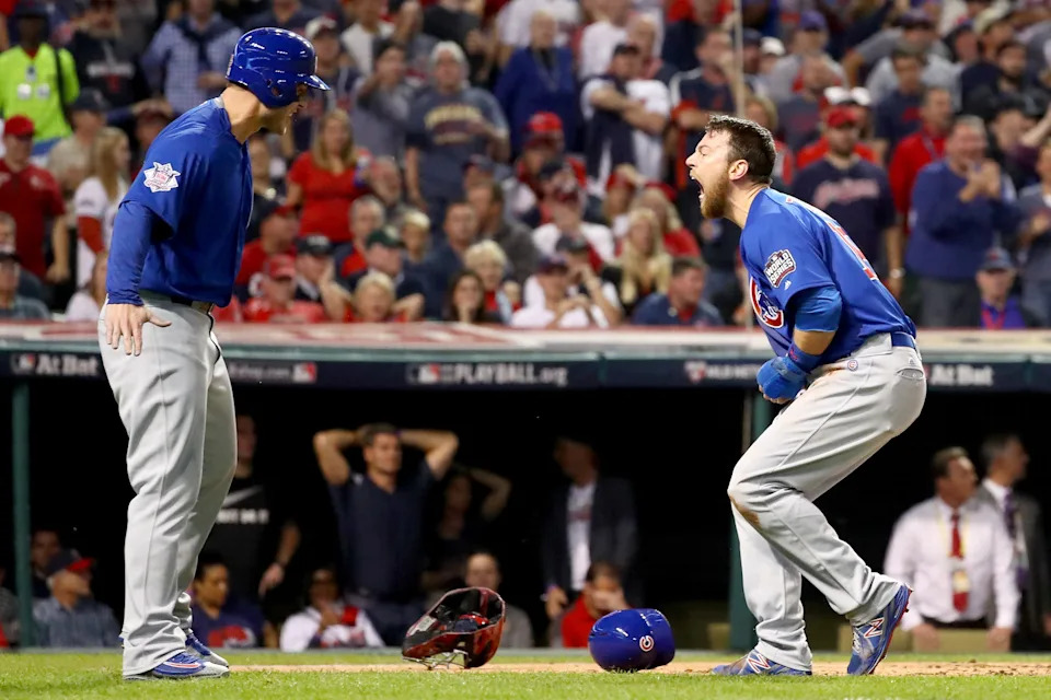 Anthony Rizzo of the Chicago Cubs celebrates after scoring a run in the 10th inning against Miguel Montero and the Cleveland Indians in Game 7 of the 2016 World Series at Progressive Field on Nov. 2, 2016, in Cleveland.