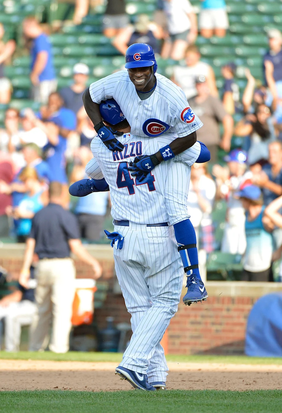 Anthony Rizzo of the Chicago Cubs and teammate Alfonso Soriano celebrate after Soriano hit a game-winning RBI single scoring Starlin Castro during the ninth inning against the Milwaukee Brewers at Wrigley Field on Aug. 30, 2012, in Chicago.