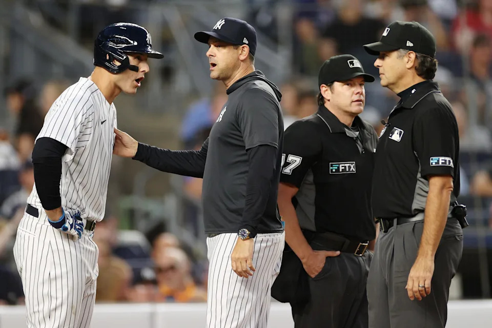 Manager Aaron Boone holds back Anthony Rizzo of the New York Yankees as he reacts to a call by umpire DJ Reyburn during the third inning against the Tampa Bay Rays at Yankee Stadium on Aug. 15, 2022, in New York.