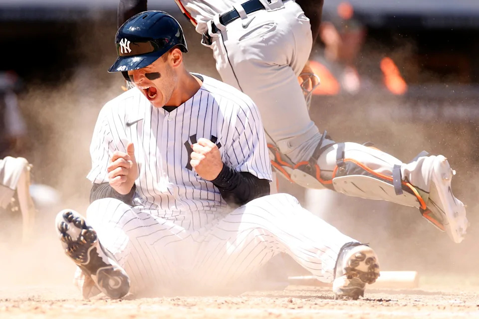 Anthony Rizzo of the New York Yankees reacts after sliding into home on an error to tie the game during the eighth inning against the Detroit Tigers at Yankee Stadium on June 5, 2022, in New York.