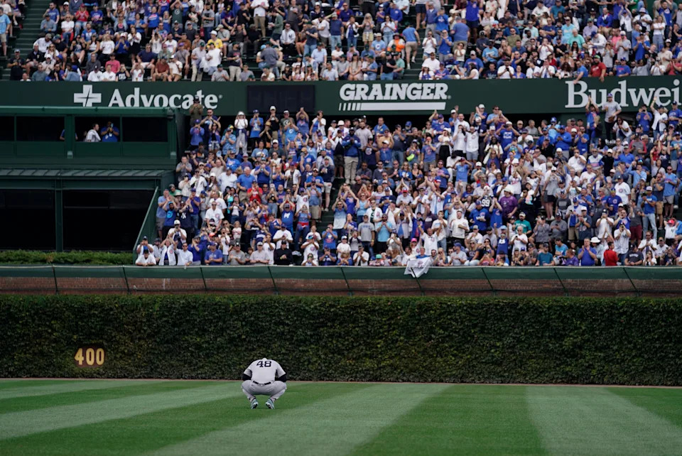 Anthony Rizzo of the New York Yankees tips his cap after a tribute video was played on the video board prior to a game against the Chicago Cubs at Wrigley Field on Sept. 6, 2024, in Chicago.