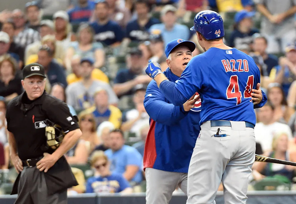 Chicago Cubs manager Rick Renteria restrains first baseman Anthony Rizzo after Rizzo was ejected by home plate umpire Jerry Meals in the fourth inning during the game against the Milwaukee Brewers at Miller Park on June 1, 2014.