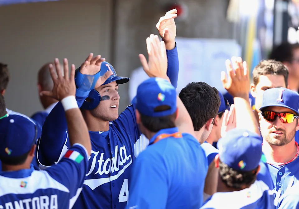 Anthony Rizzo of Team Italy high-fives teammates in the dugout after scoring a first inning run against Mexico during the World Baseball Classic group stage game at Salt River Fields at Talking Stick on March 7, 2013, in Scottsdale, Arizona.