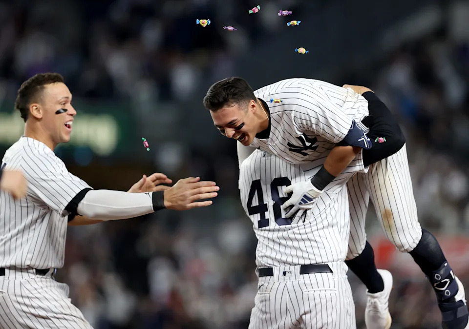 Aaron Judge, Anthony Rizzo and Anthony Volpe of the New York Yankees celebrate their win over the Baltimore Orioles after Volpe drove in the game-winning run with a sacrifice fly in the 10th inning at Yankee Stadium on May 23, 2023, in New York.