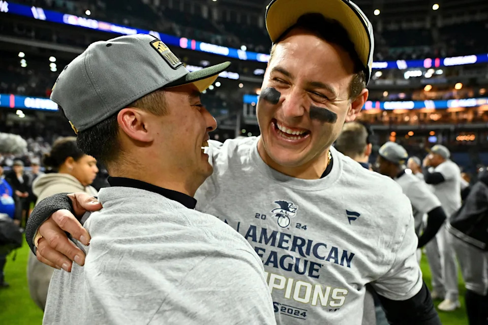 Anthony Rizzo and Juan Soto of the New York Yankees celebrate as the Yankees win Game 1 of the American League Championship Series against the Cleveland Guardians at Yankee Stadium on Oct. 14, 2024, in New York.