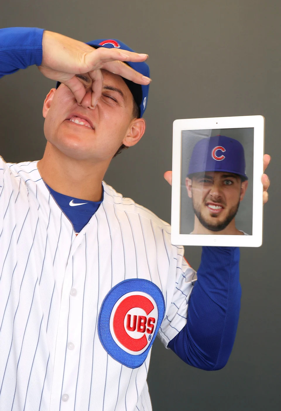 Anthony Rizzo of the Chicago Cubs poses with a photo of teammate Kris Bryant during Chicago Cubs Photo Day on Feb. 21, 2017, in Mesa, Arizona.