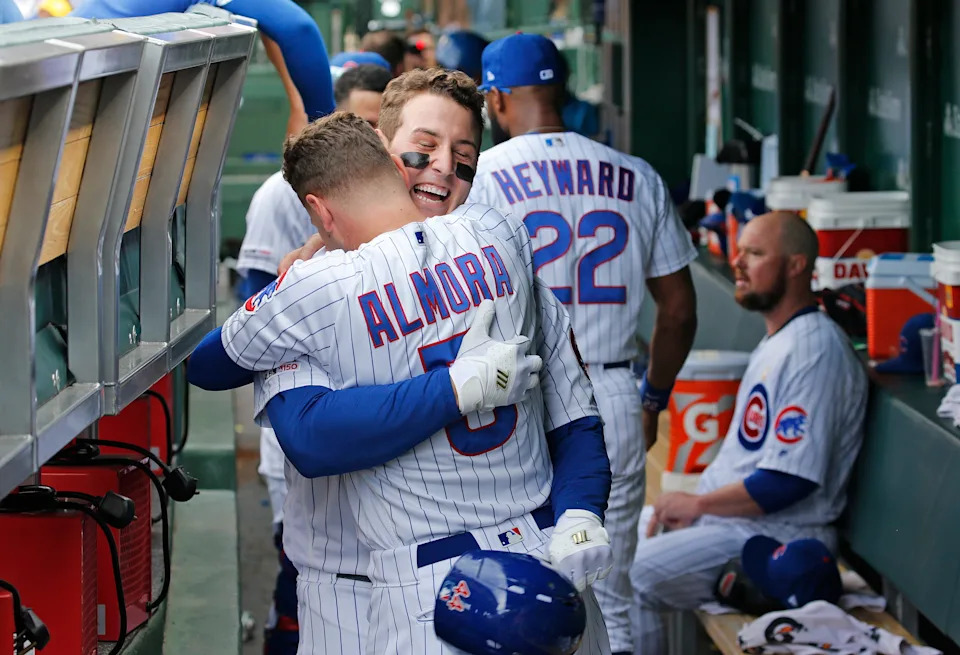 Anthony Rizzo of the Chicago Cubs gets a hug from Albert Almora Jr. in the dugout after his grand slam during the third inning of a game against the Pittsburgh Pirates at Wrigley Field on Sept. 13, 2019, in Chicago.