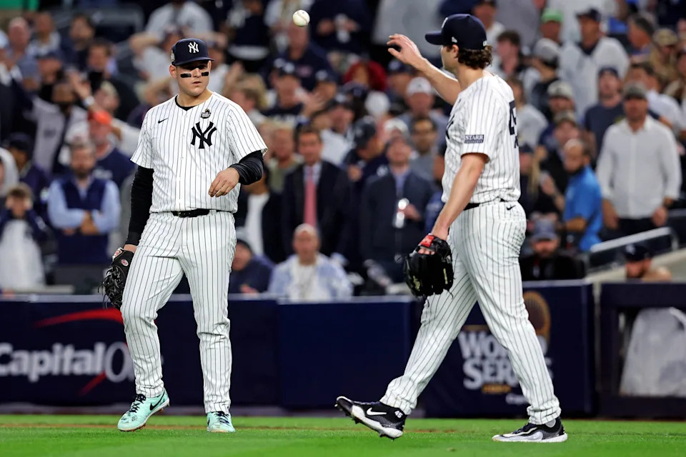 New York Yankees first baseman Anthony Rizzo talks with pitcher Gerrit Cole after Cole didn’t cover first base allowing a base hit during the fifth inning against the Los Angeles Dodgers in Game 5 of the 2024 World Series at Yankee Stadium on Oct. 30, 2024.
