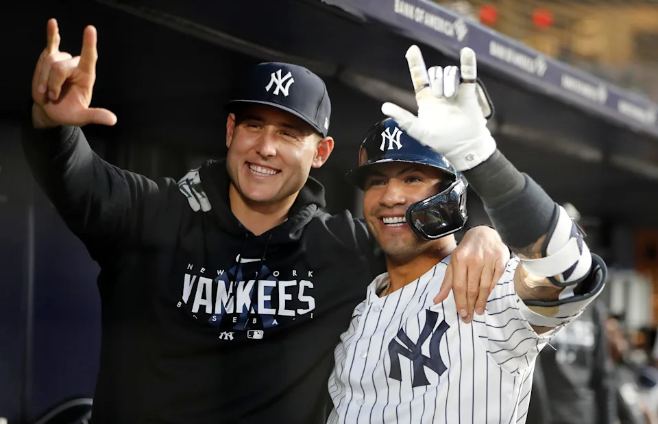 Gleyber Torres f the New York Yankees celebrates his fourth inning home run against the Boston Red Sox in the dugout with teammate Anthony Rizzo at Yankee Stadium on June 10, 2023, in New York.