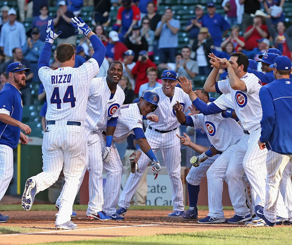 Anthony Rizzo is mobbed by his teammates after scoring the winning run against the Pittsburgh Pirates during the eleventh inning on July 7, 2013. The Chicago Cubs defeated the Pittsburgh Pirates 4-3 in 11 innings.