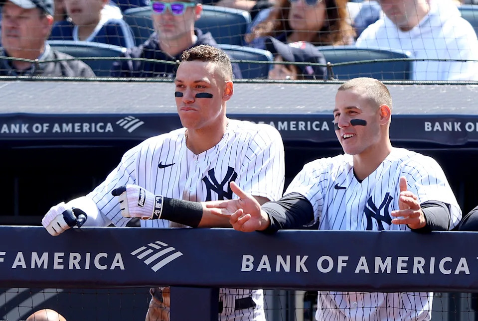 Aaron Judge and Anthony Rizzo of the New York Yankees talk in the dugout during the first inning against the Cleveland Guardians at Yankee Stadium on April 24, 2022, in New York.