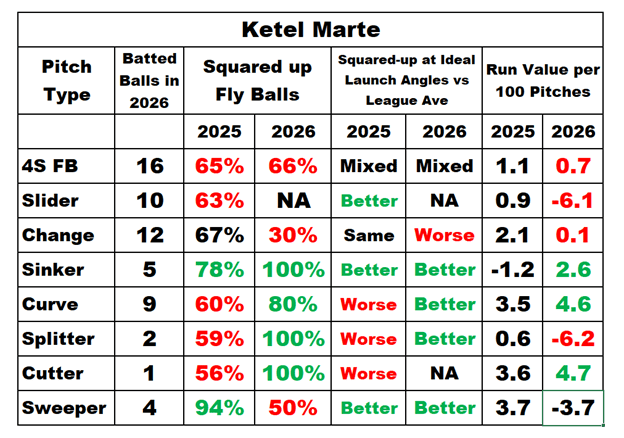 Marte improved last season’s results for sinkers, curves, and cutters. For each of those pitch types, he improved his squared- up percentages. Despite the inspiring round table question, he does not appear to be in a slump.