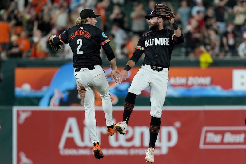 Gunnar Henderson #2 and Colton Cowser #17 of the Baltimore Orioles celebrate after winning a baseball game against the New York Yankees at Oriole Park at Camden Yards on Sept. 19, 2025, in Baltimore, Maryland. (Jess Rapfogel/Getty Images/TNS)