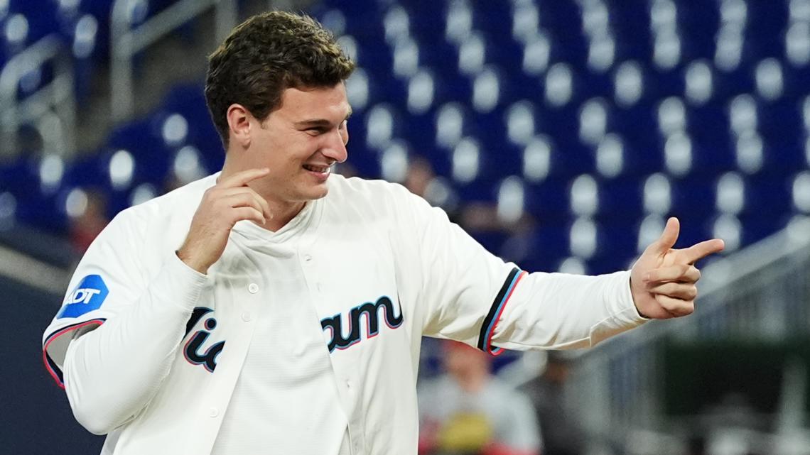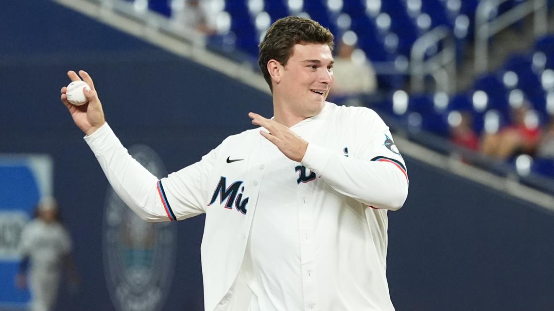 Heisman Trophy winner and national champion Fernando Mendoza tossed out the first pitch prior to tonight’s @Marlins game! pic.twitter.com/OCSlrl3Kot
