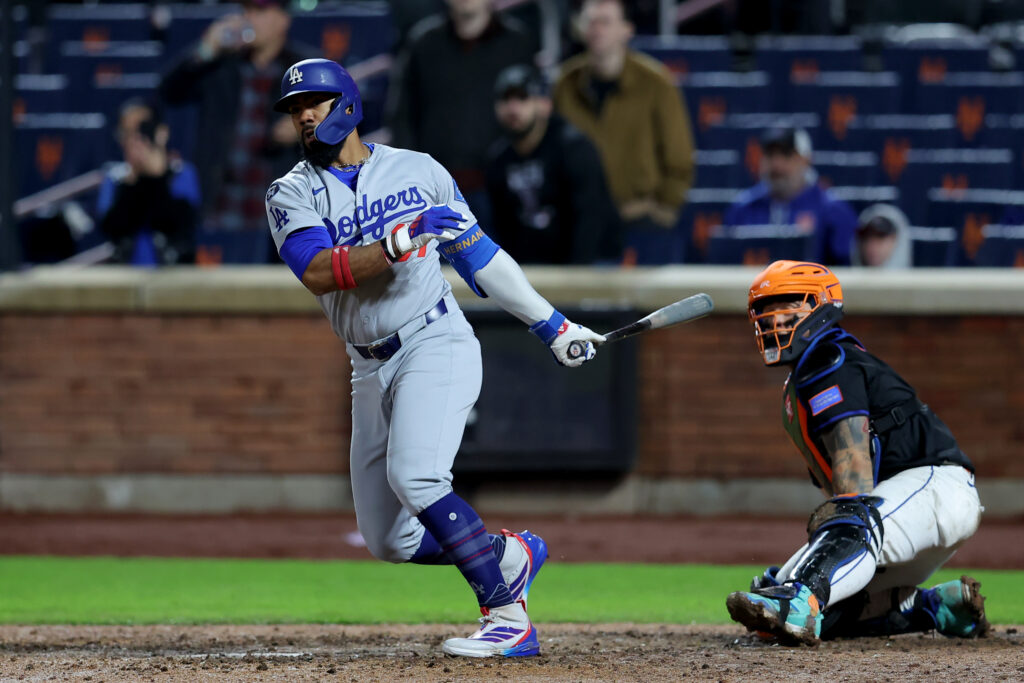 May 23, 2025; New York City, New York, USA; Los Angeles Dodgers right fielder Teoscar Hernandez (37) follows through on an RBI single against the New York Mets during the thirteenth inning at Citi Field. Mandatory Credit: Brad Penner-Imagn Images