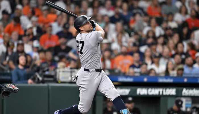 New York Yankees designated hitter Giancarlo Stanton hits the ball in the third inning against the Houston Astros at Daikin Park on Apr 24, 2026. — Reuters