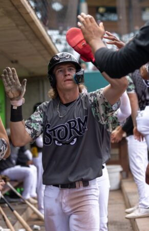 The right-handed hitter is currently wiry in stature and is building strength in his body. That is what the Padres want from the youngster, and he discusses that fact. “Our strength coach does a great job. We lift three or four times a week. We do sprint sessions and stuff like that,” Evans tells EVT this week. At 6-foot-4 and 210 lbs. Evans can easily add more muscle and fill out. The 22-year-old will do that in time. “The Padres and Storm staff created a baseline of what they wanted from me as far as working out. The Storm adds to anything I need as they see me play every day.”