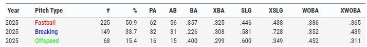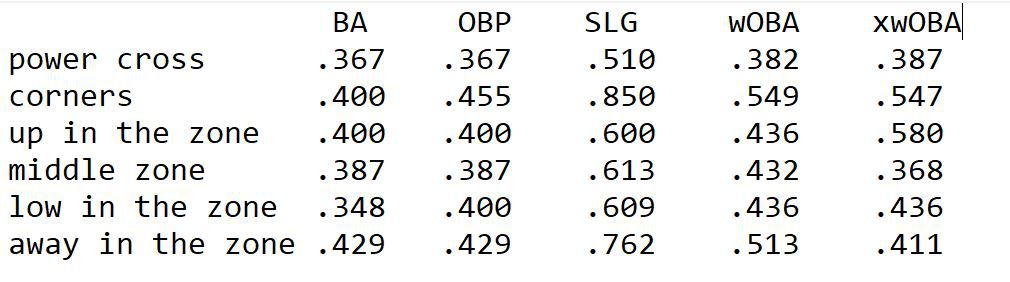 Those all look pretty healthy to me. He’s hitting only .226 versus breaking pitches, but that comes with a .581 slugging percentage and .439 xwOBA. He doesn’t look particularly vulnerable to one type of pitch versus another. Is there a particular part of the strike zone that he has trouble with?