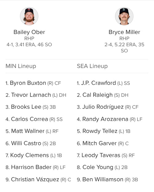 Young slots into the eight-spot for his debut, and Garver behind the plate while Cal takes DH duty and Polanco gets a day off. The Mariners will have to face off against Bailey Ober, who, for my money, is among the most underrated starters in baseball, consistently putting up above-average performances outing after outing to little fanfare for years now.