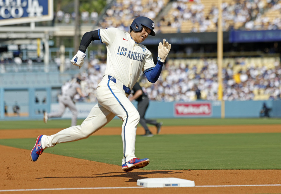 Shohei Ohtani of the Los Angeles Dodgers rounds third base on his way to scoring a run against the New York Yankees during the first inning at Dodger Stadium in Los Angeles on May 31, 2025. (Kyodo) ==Kyodo