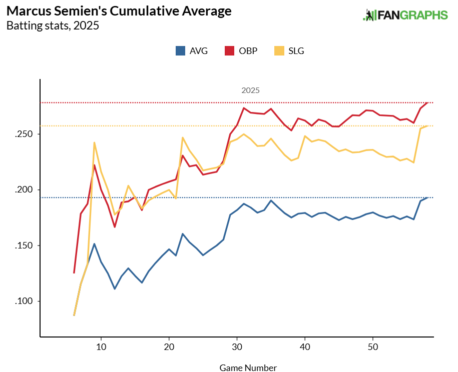 But he has done it before. Semien has gone on to a solid season despite a dire first two months of the season. The only difference is that Semien has another three years and ~500 MLB games in his legs. It might not be as easy to flip a switch and start performing at a high level anymore.