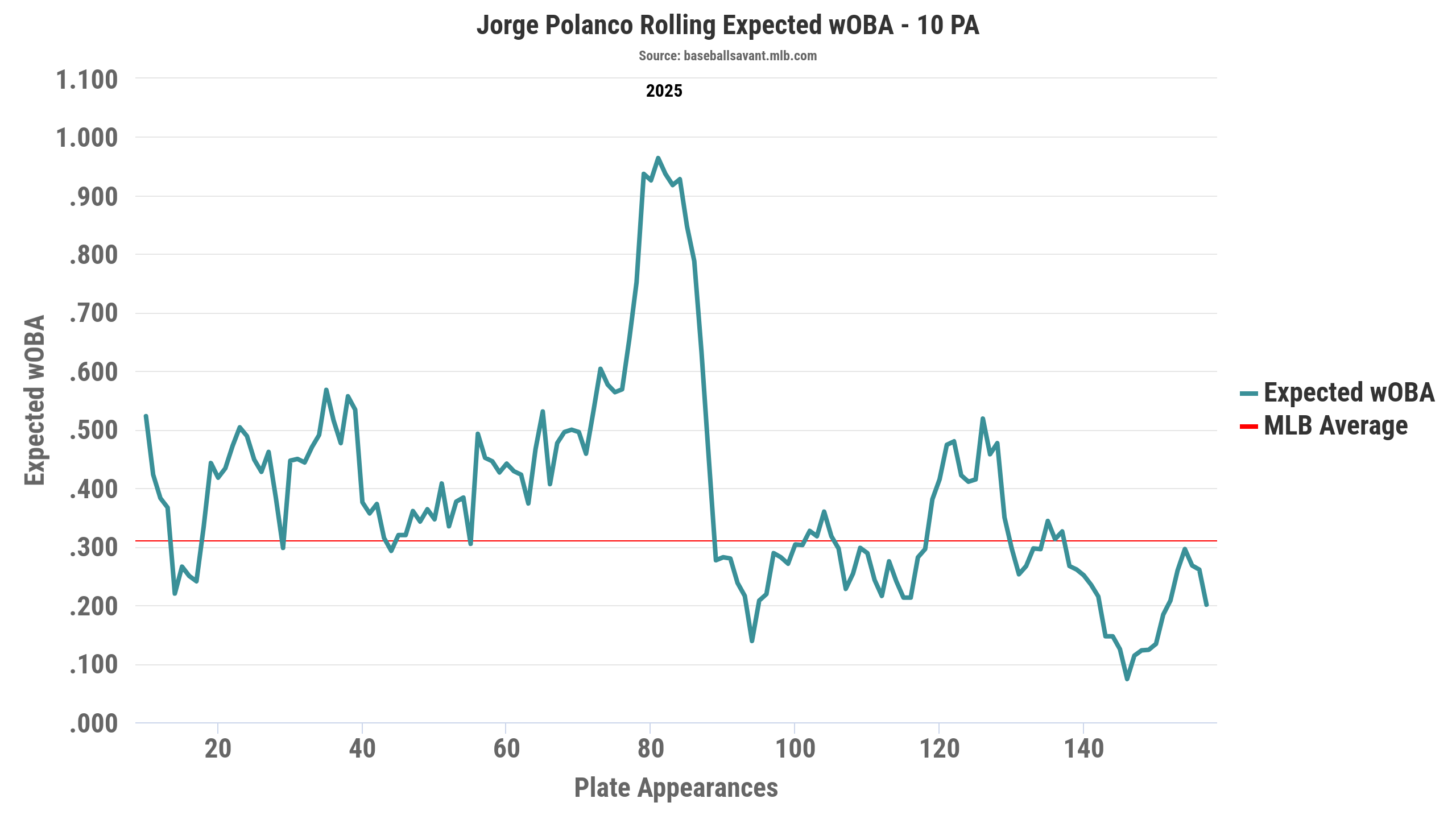 Since May 1, Polanco is hitting .139/.205/.208 with one home run and a 23 wRC+. Normally, when a player has two similar-length periods with vastly different results, the truth lies somewhere in between. While that is still the case here, it’s more likely that Polanco has a repeat of May than April.