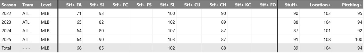 The just-turned-26-year old pitcher is a good example of the limits of something like xFIP. xFIP assumes a 10.6% HR/FB rate, but Elder has always been given up home runs more often than that. While he doesn’t give up a ton of fly balls, those fly balls tend to get hit hard. And Statcast and Stuff+ bear that out. Oh well, hopefully today’s matchup isn’t …