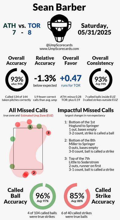 I often put the Umpire Scorecard up when the Jays get (what is the polite term?) hosed. So let’s put one up where the umpire helped them out: