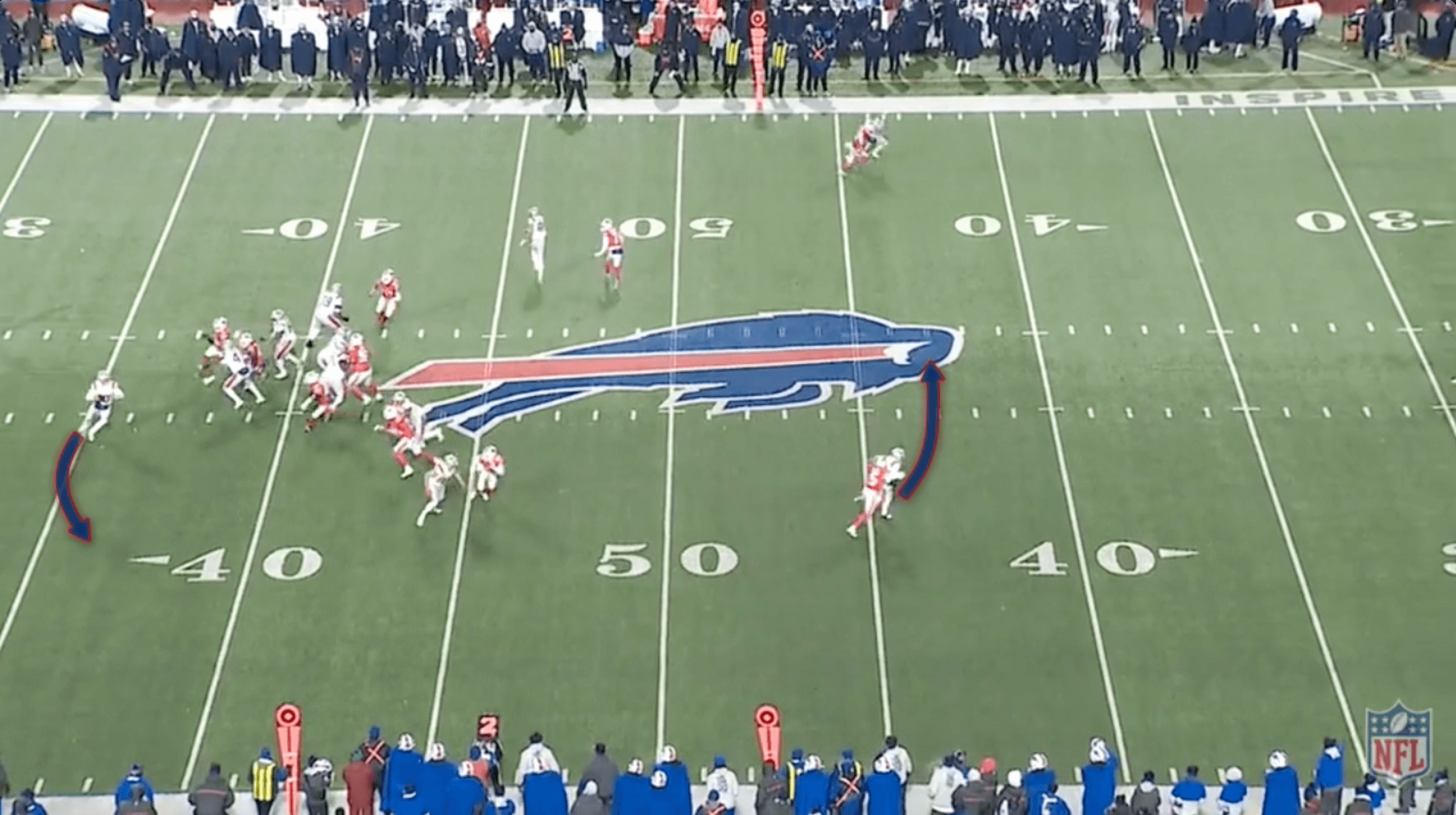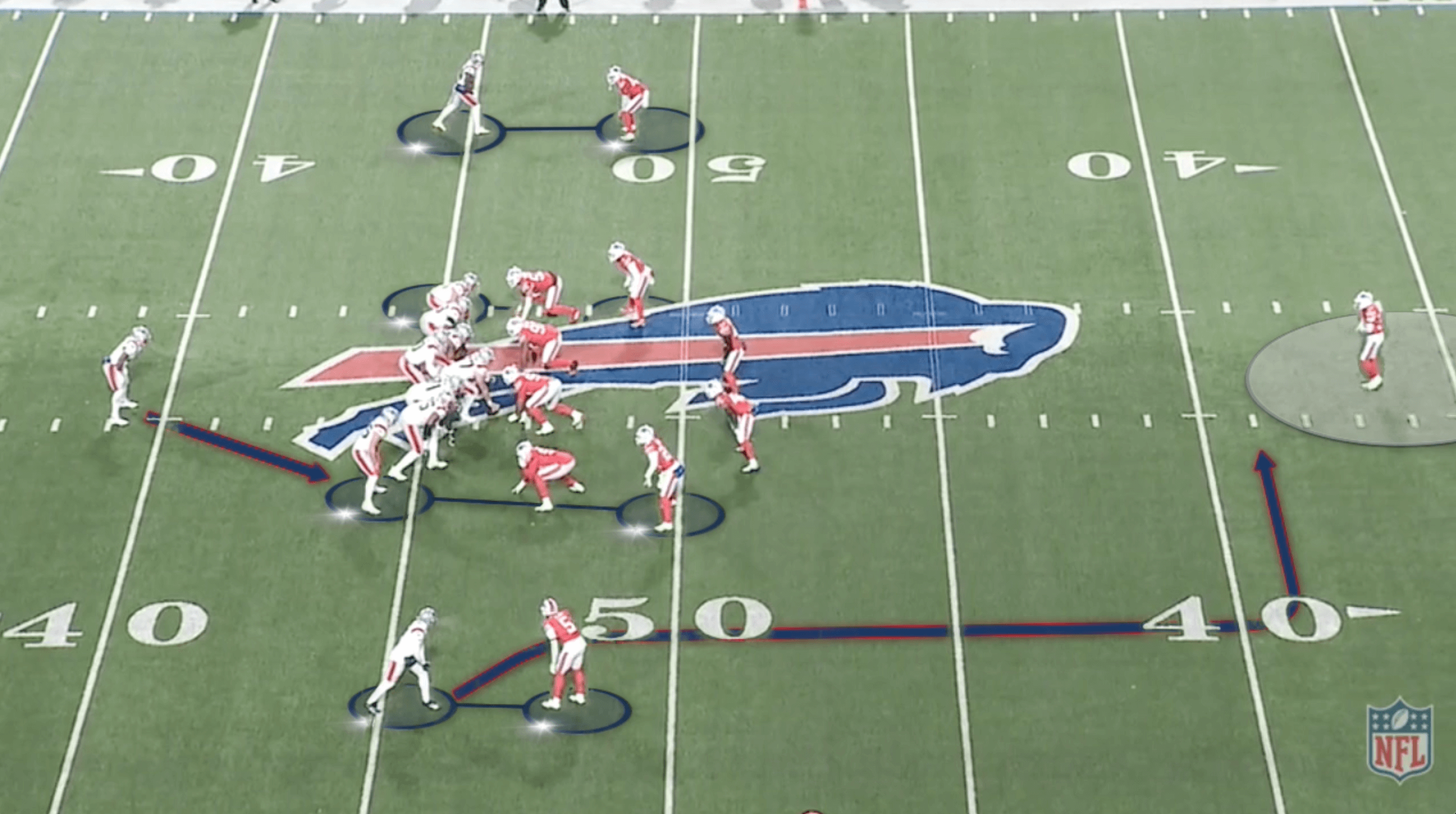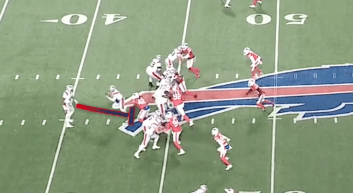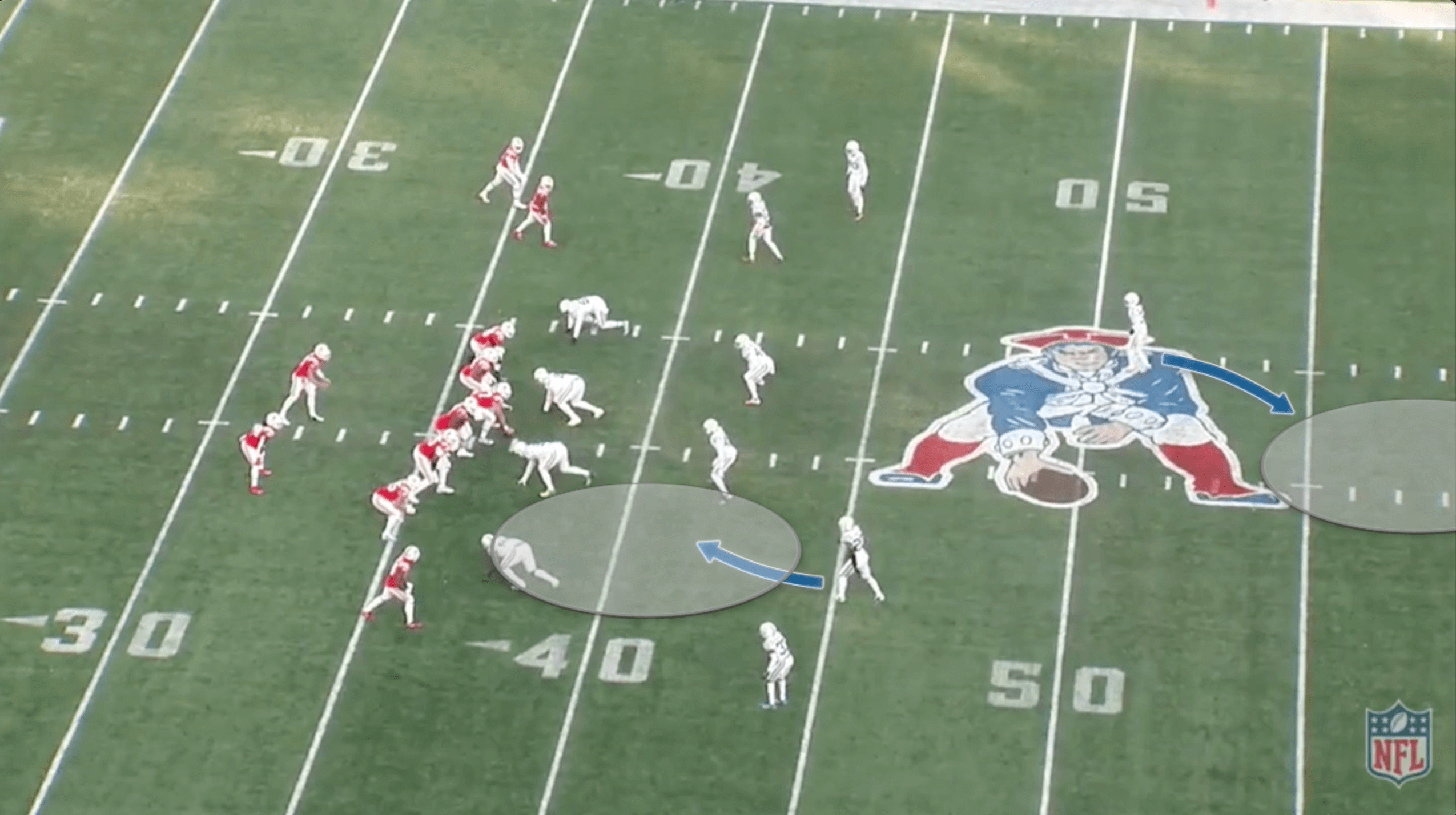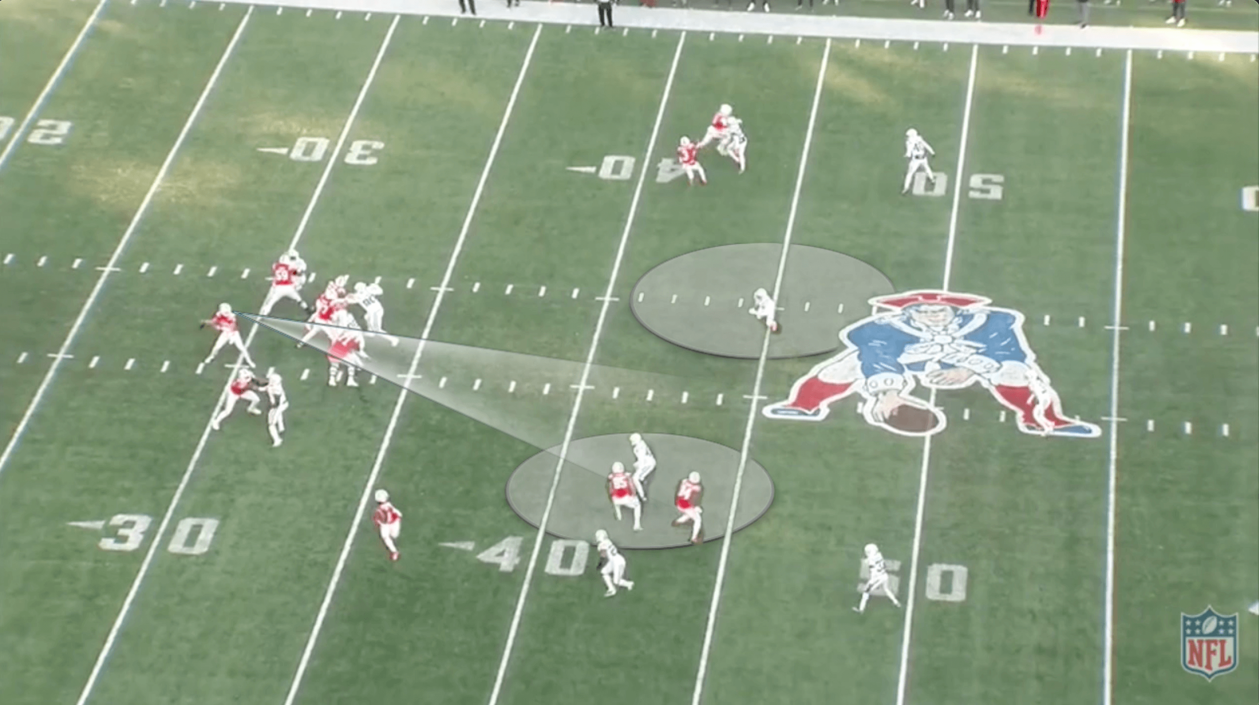 The Patriots had a play-action concept with a dig route on this play against the Bills. The defense crowded the box and played man coverage.