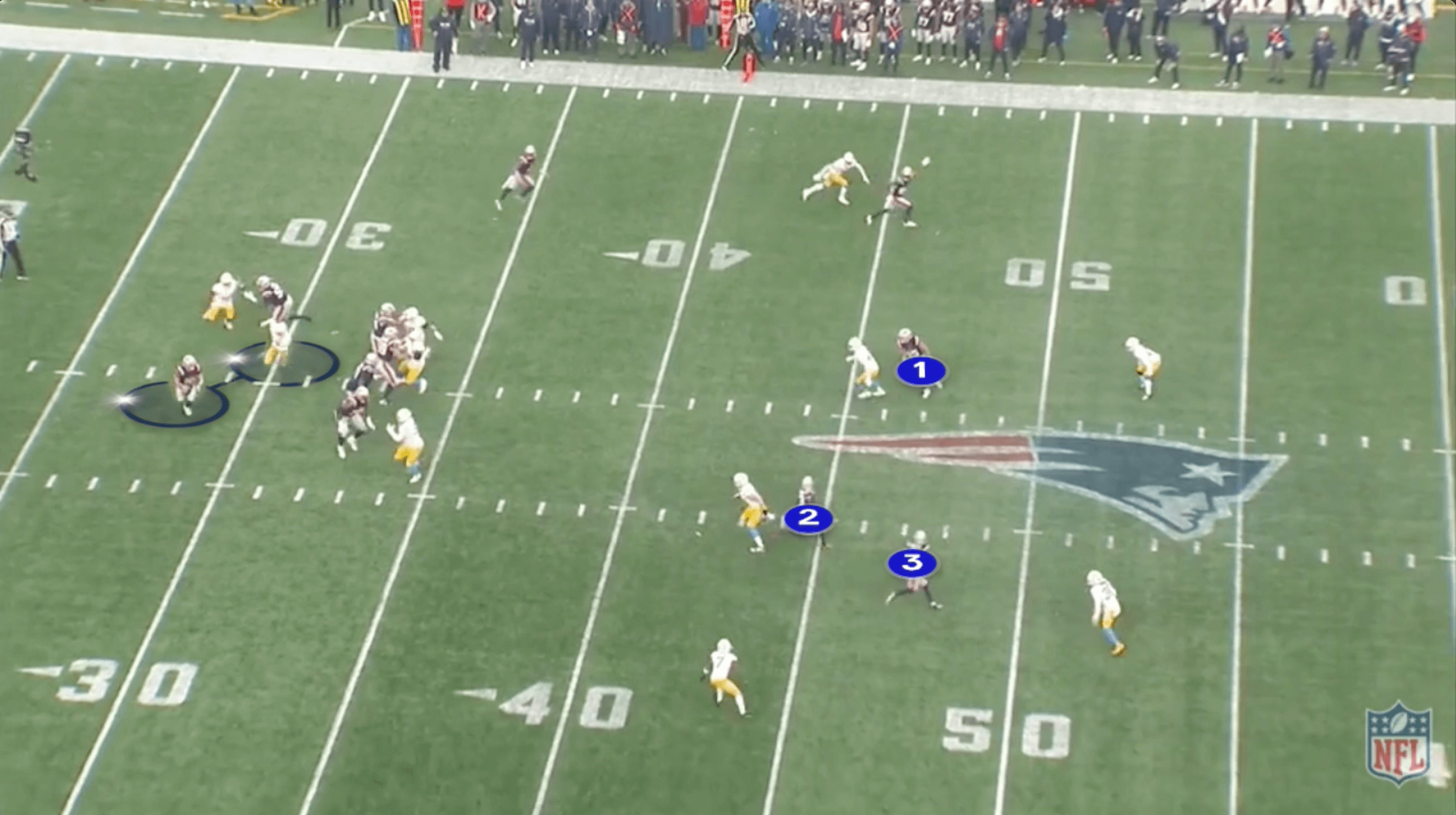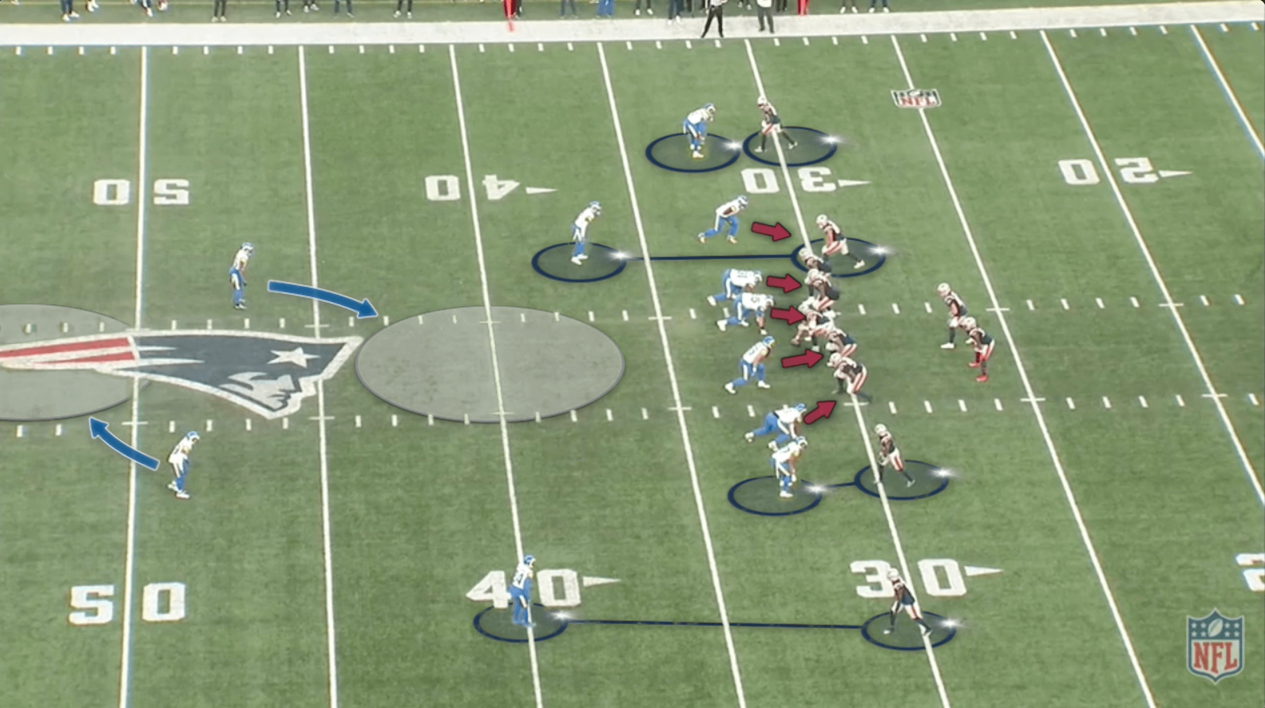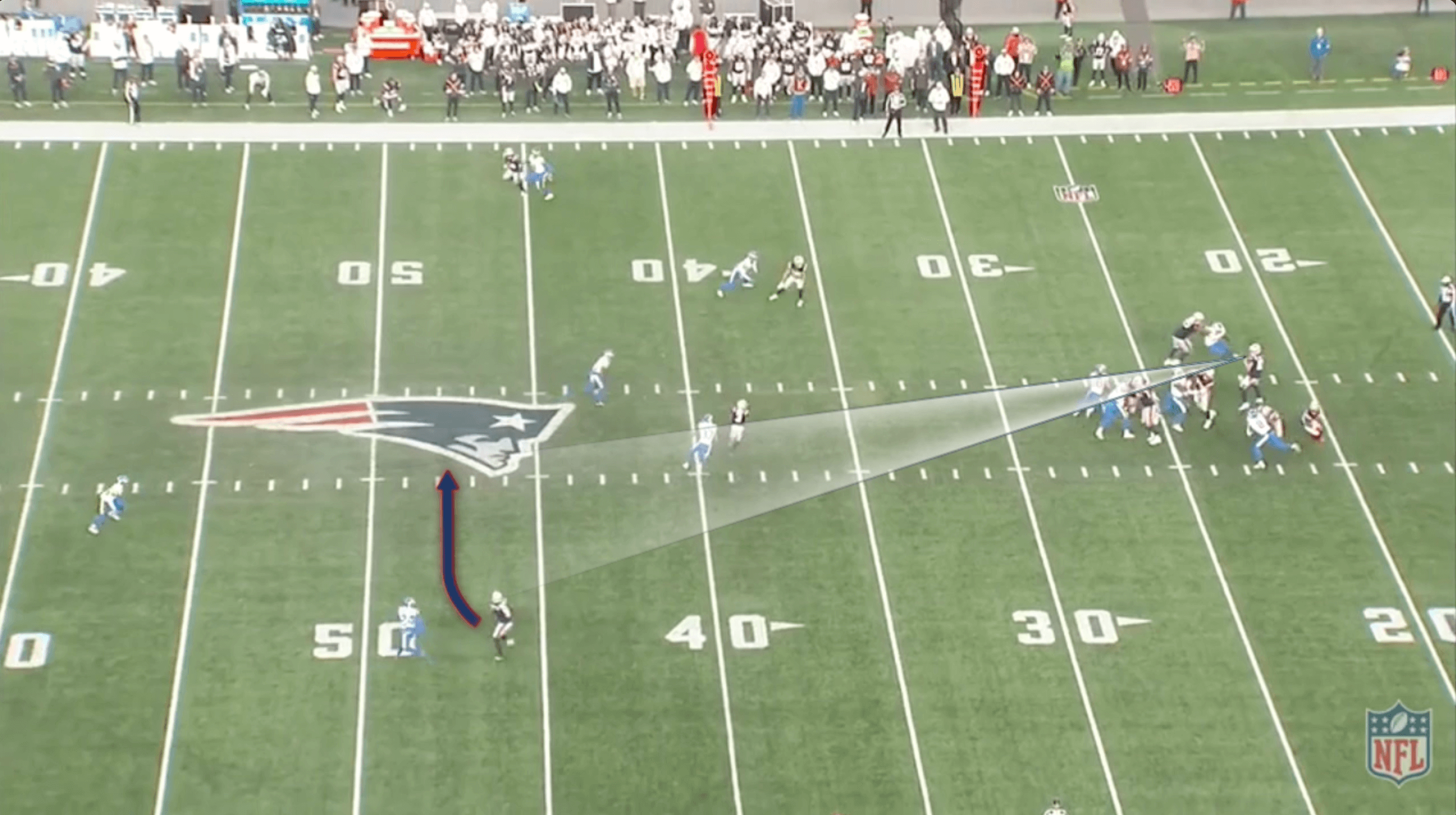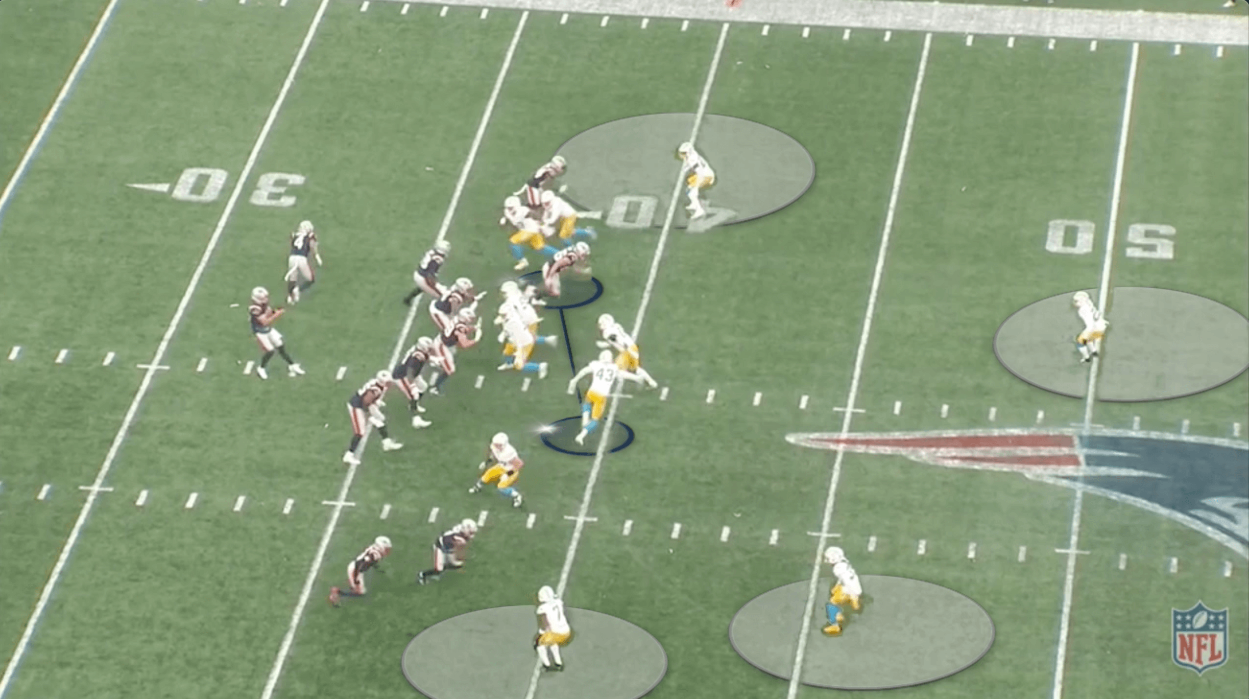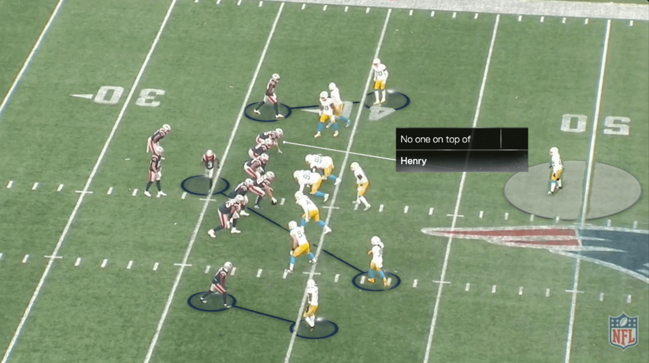 On this play, the Chargers initially gave the Patriots a man coverage look with no one on top of Henry to bait Maye to look in his direction.