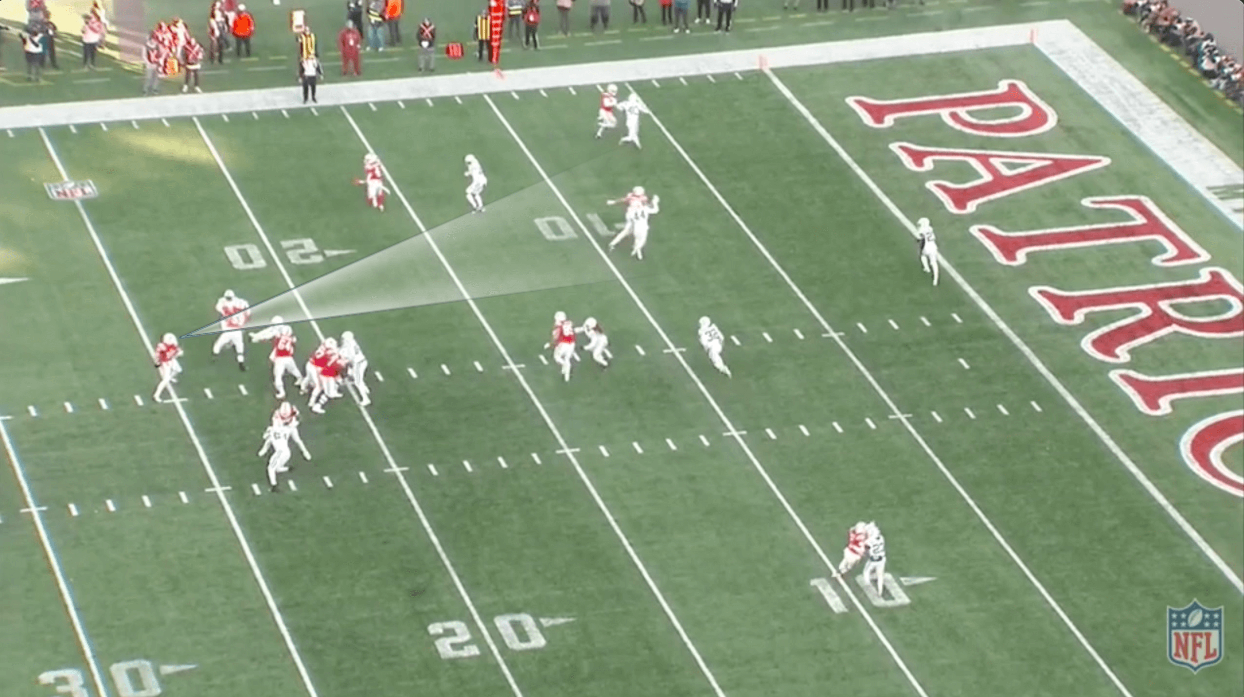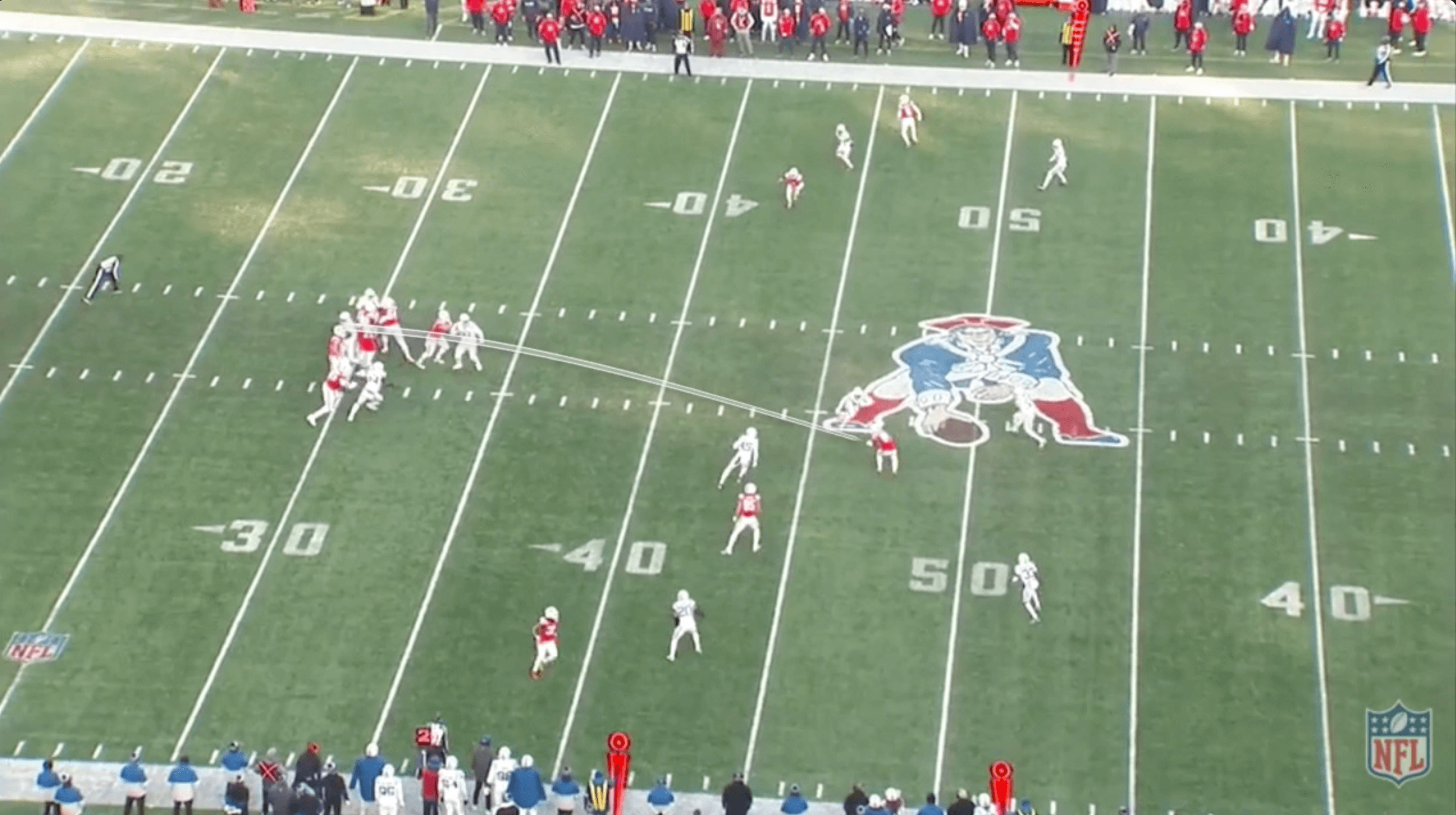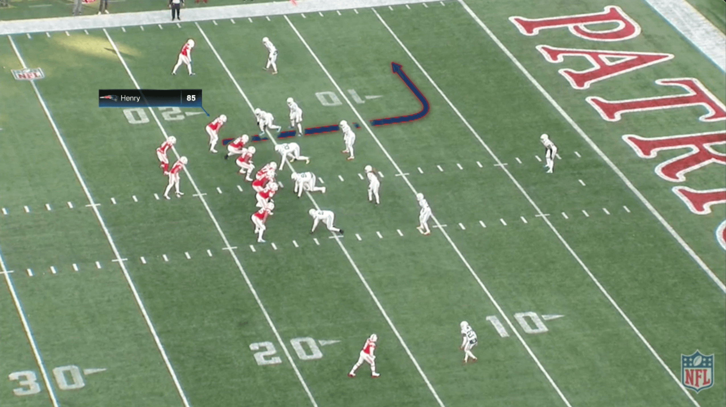 With Henry bracketed with an underneath defender and a safety over the top, Maye had to look elsewhere.