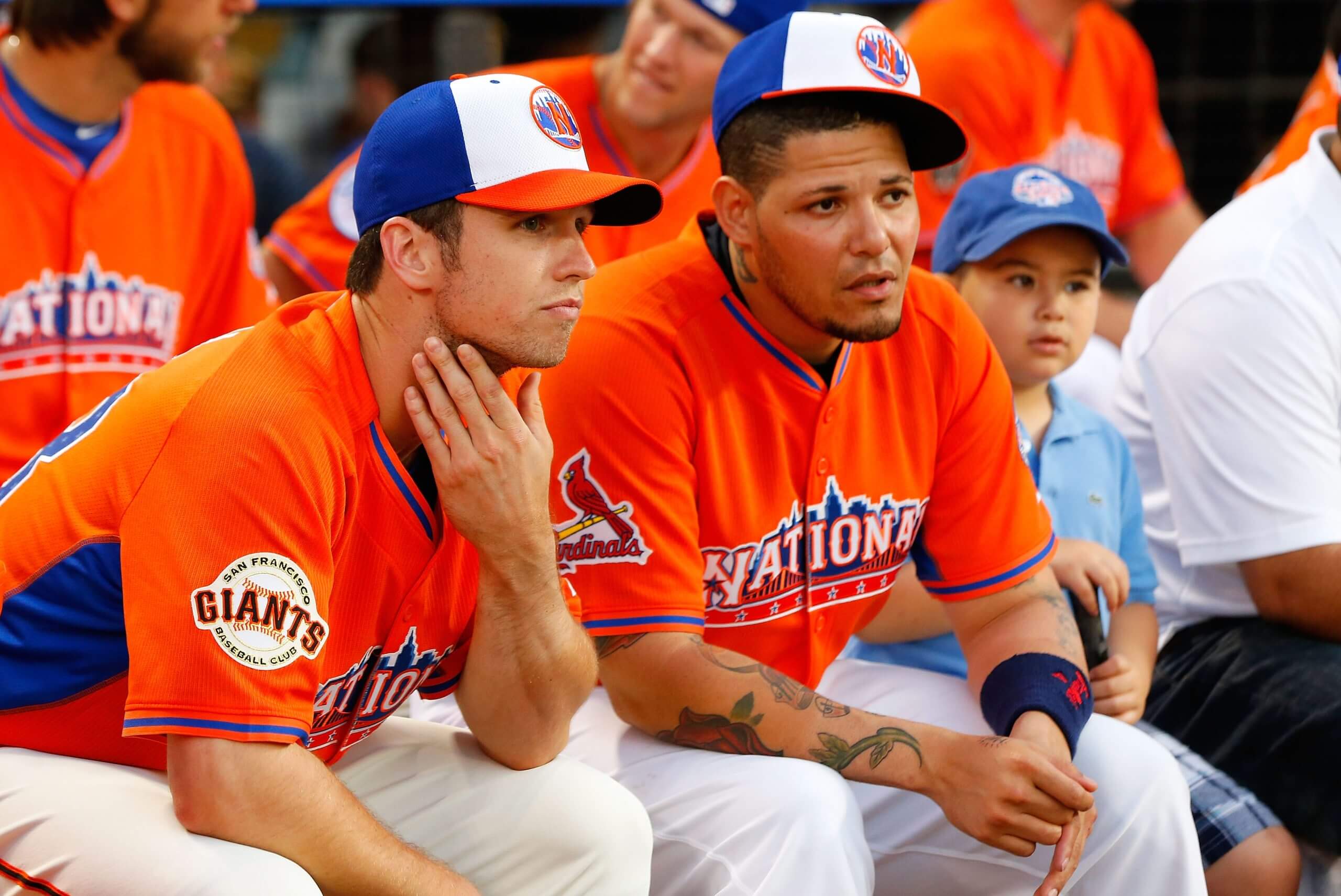 Buster Posey and Yadier Molina watch the Home Run Derby in 2013. (Jim McIsaac / Getty Images)