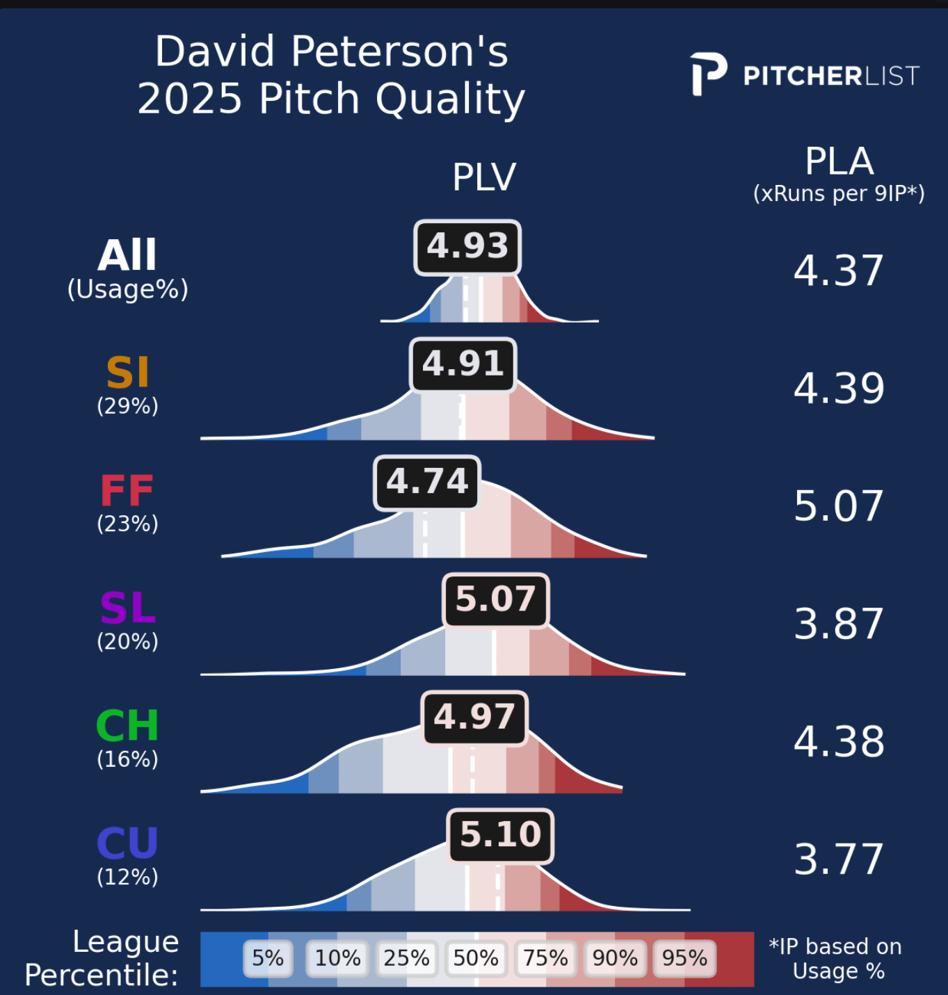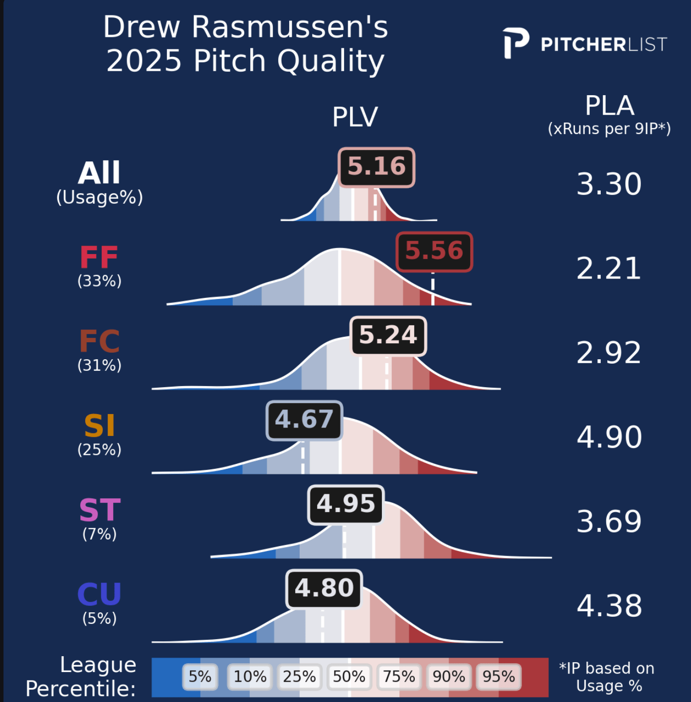 Rasmussen is a bit of a PLV darling, which is reflected by his great PLA. He is a fastball pitcher, as he features three distinct fastballs that all provide him with quick outs. PLV LOVES his four-seamer, as it’s a pitch he commands incredibly well and gets quick outs with. His cutter is arguably his best pitch, as it’s PLV numbers two years ago were amazing, and when it’s located well, he gets tons of whiffs on it. Unfortunately, he hasn’t found consistency with it yet, but PLV still really approves of the pitch. The sinker is far from his best pitch, as PLV doesn’t grade it out super well, though if he throws it like he did in his recent start against the Twins, its metrics will certainly improve.