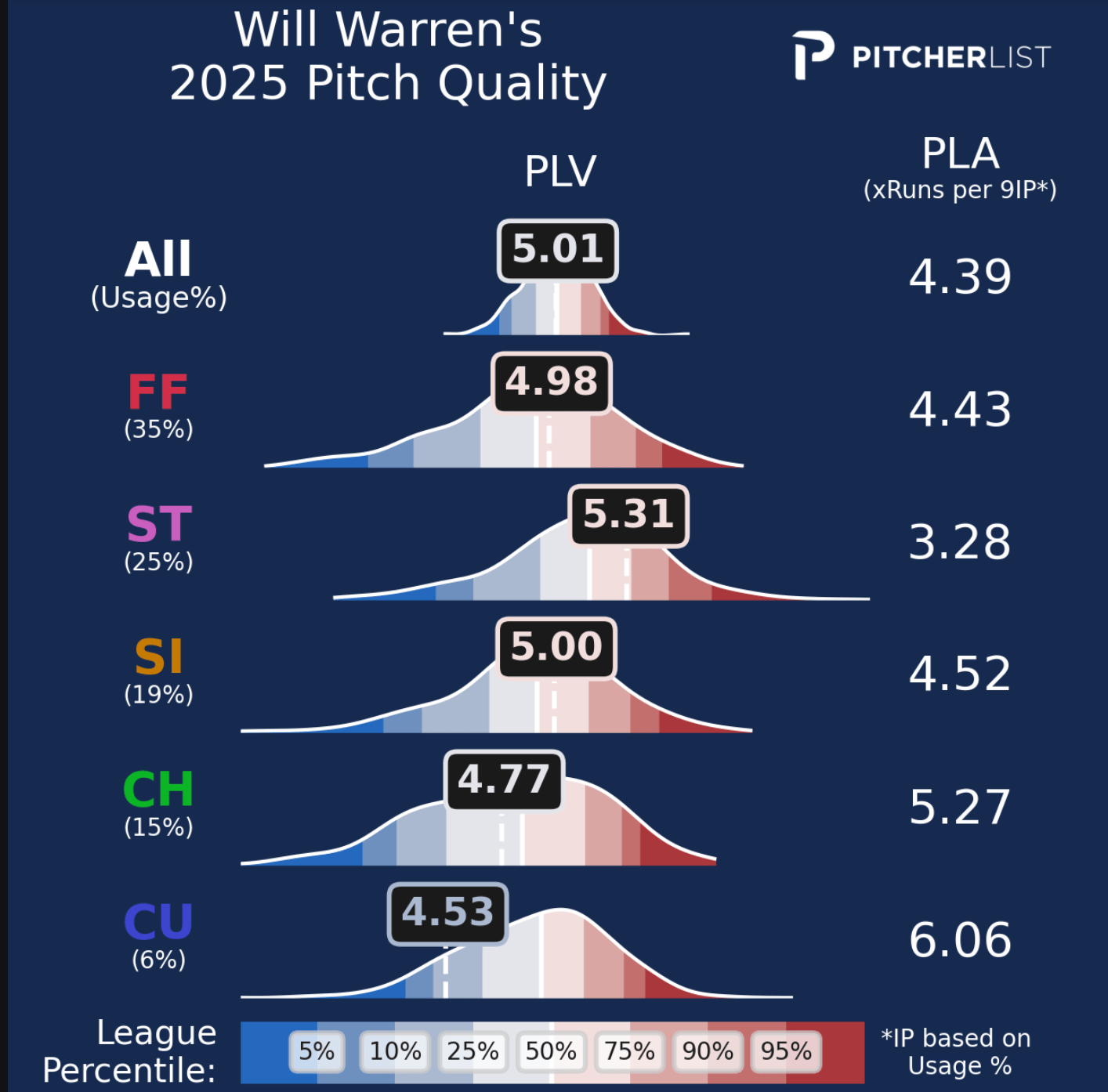 So why is his PLA lower on him? Largely due to command. Warren can struggle to locate his pitches, which has led to below-average strike rates on nearly one of his offerings. He has a flat-angle four-seamer but doesn’t get the pitch upstairs quite enough to make it an elite offering. He still gets plenty of swing-and-miss on it, though, but it could be even better! His sweeper is the key pitch, as it moves with TONS of horizontal break. In fact, the pitch is 98th percentile in the stat. The pitches at the back of his arsenal are where things get ugly, according to PLV, though. The sinker is an alright addition that has plenty of horizontal break, but the changeup and curveball are definitely lacking in terms of both stuff and command.