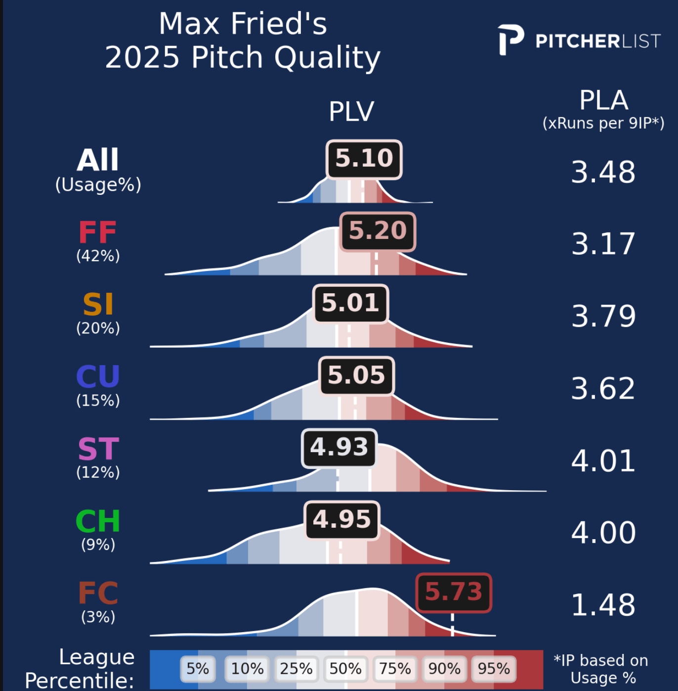 Pitch-modeling statistics aren’t always going to be the most in on Fried, as he isn’t a “stuff” pitcher (though honestly, he can be underrated in that regard), but PLA still shows that he’s a strong pitcher, even if it doesn’t project him to be a sub-2 ERA guy.