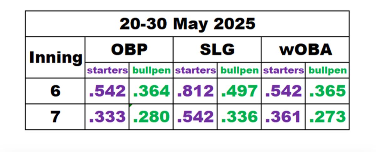 Starting Pitching. Data surprisingly showed me that when each starting pitcher goes beyond a specific number of innings, their results are worse than the bullpen. The Baseball Savant data that initially grabbed my attention is in the following table: