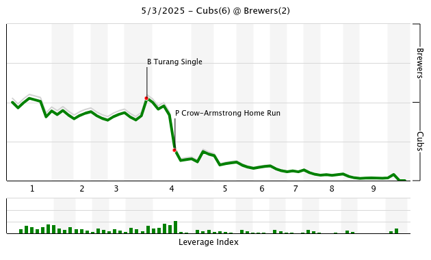 *Brewers Play of the Game: Brice Turang batted with a runner on second and two outs in the third inning, the Cubs up one. He singled and a run scored, tying the game. (.112)