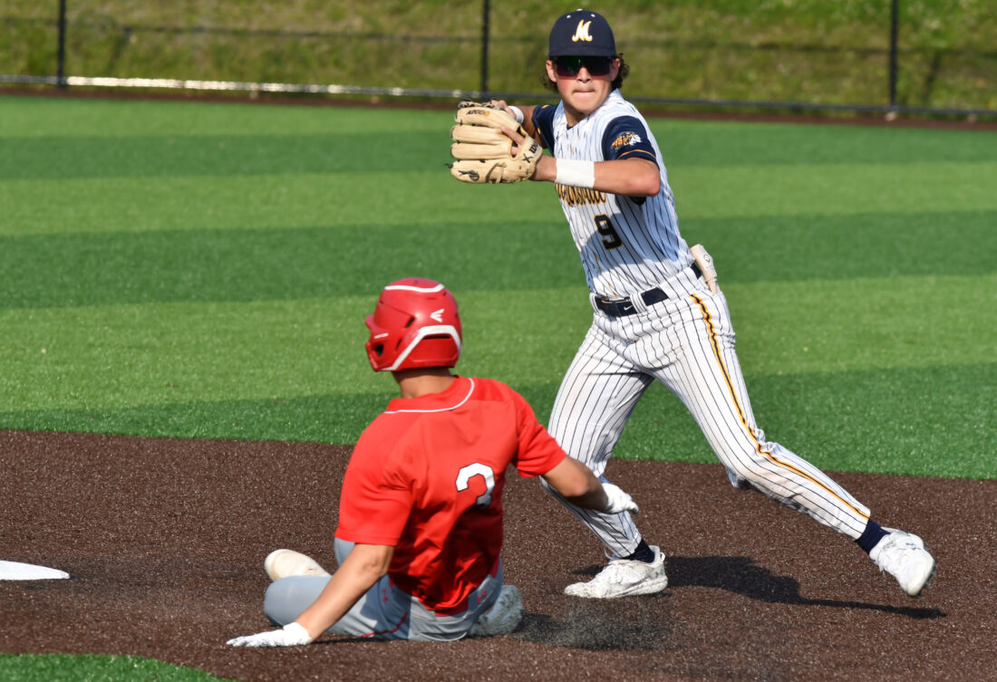 Montoursville second baseman Royce Bowes (9) forces out Crestwood’s Jack Rodgers before turning-two in the first inning.