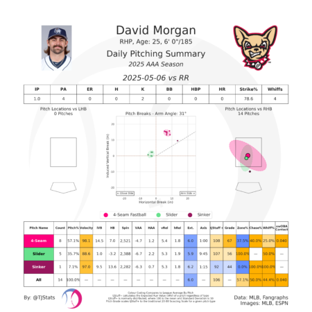 While starter Wes Benjamin was rocked for six runs in 4.2 innings of work, the Chihuahuas’ bullpen had a very strong performance, tossing 4.1 innings of one-run baseball. Kevin Kopps was the first to enter the game, and would ultimately earn the win after 1.1 innings of one-run ball. Right-hander David Morgan made his El Paso debut and flashed impressive stuff despite the pitching environment, getting whiffs on 44% of swings while hitting 98.1 mph on the fastball. The Stuff+ grades on Morgan’s pure stuff is enough to make the nerds salivate, as seen in the graphic below.