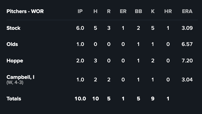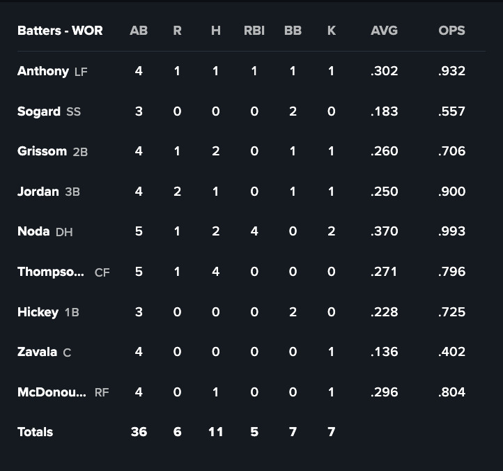 The game was kept close by a strong six innings by Robert Stock, who only looked weak when he was taken yard by Brady House, a Washington prospect who’s “kicking down the door” in his own way. Speaking of kicking down the door… if you’re asking how the score got tied after Worcester hadn’t scored since the third, look no further than that man Roman Anthony, who hit a solo shot in the bottom of the ninth on a full count. The longball had a WPA of .469 and should draw the ire of any Red Sox fan who have been watching the team lose by one seemingly every night for two weeks now. Worcester is now one game over .500 and starts in just a few minutes, at 11:05 AM.