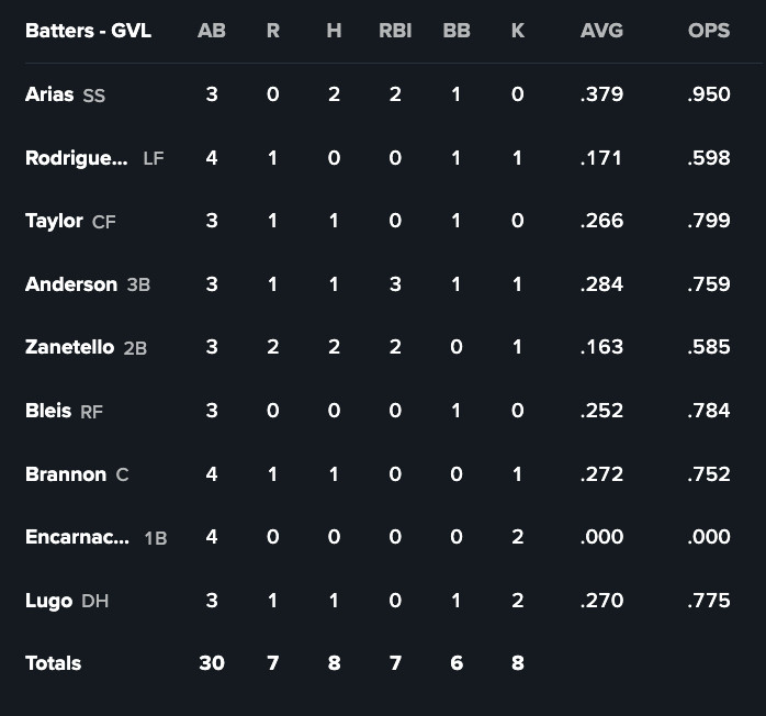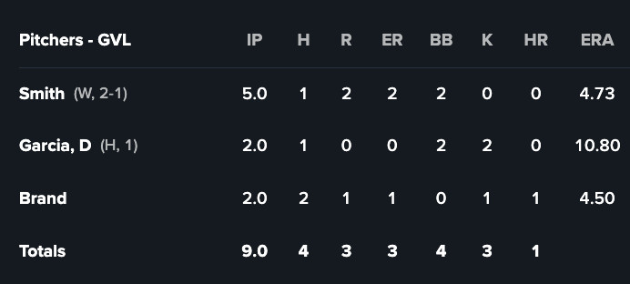 Were we just talking about leadoff guys who can hit? After finishing May with a .404 batting average across Salem and Greenville, Franklin Arias captured another two hits and has failed to reach base just once since being promoted. But the real focus of the game was Nazzan Zanetello’s two home runs in his first two plate appearances. Zanetello’s been sat down on strikes a lot this season, but he got the better of Rome (Braves High-A) pitching Tuesday. So, too, did Antonio Anderson, who opened up the scoring with a home run of his own. Thanks to a strong four-run inning in the first, Greenville was able to cruise behind a confident Adam Smith start: he may not have gotten any strikeouts and found the strike zone on just 35 of his 60 pitches, but he induced 10 grounders in his 15 outs.