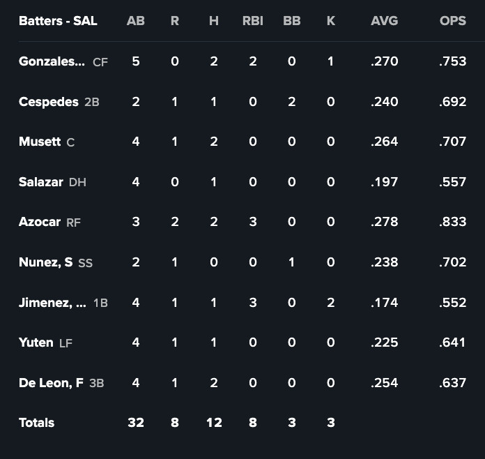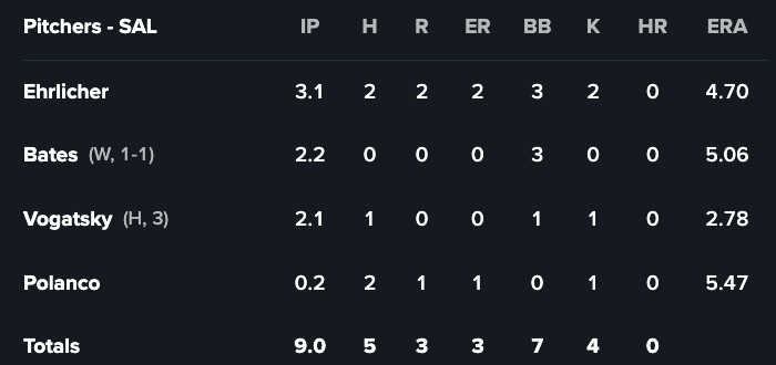 Salem was the third of three teams to hold their opposition to three runs: that they did this while giving up seven walks is even more impressive, but it can be attributed to Lynchburg (Guardians A) going 0-for-12 with runners in scoring position. This amount of opportunities is thanks to the Hillcats treating Andruw Mussett’s dish like a track meet, running on him five times. But, one can never complain when eight of Salem’s nine batters had a knock and four managed multiple hits.